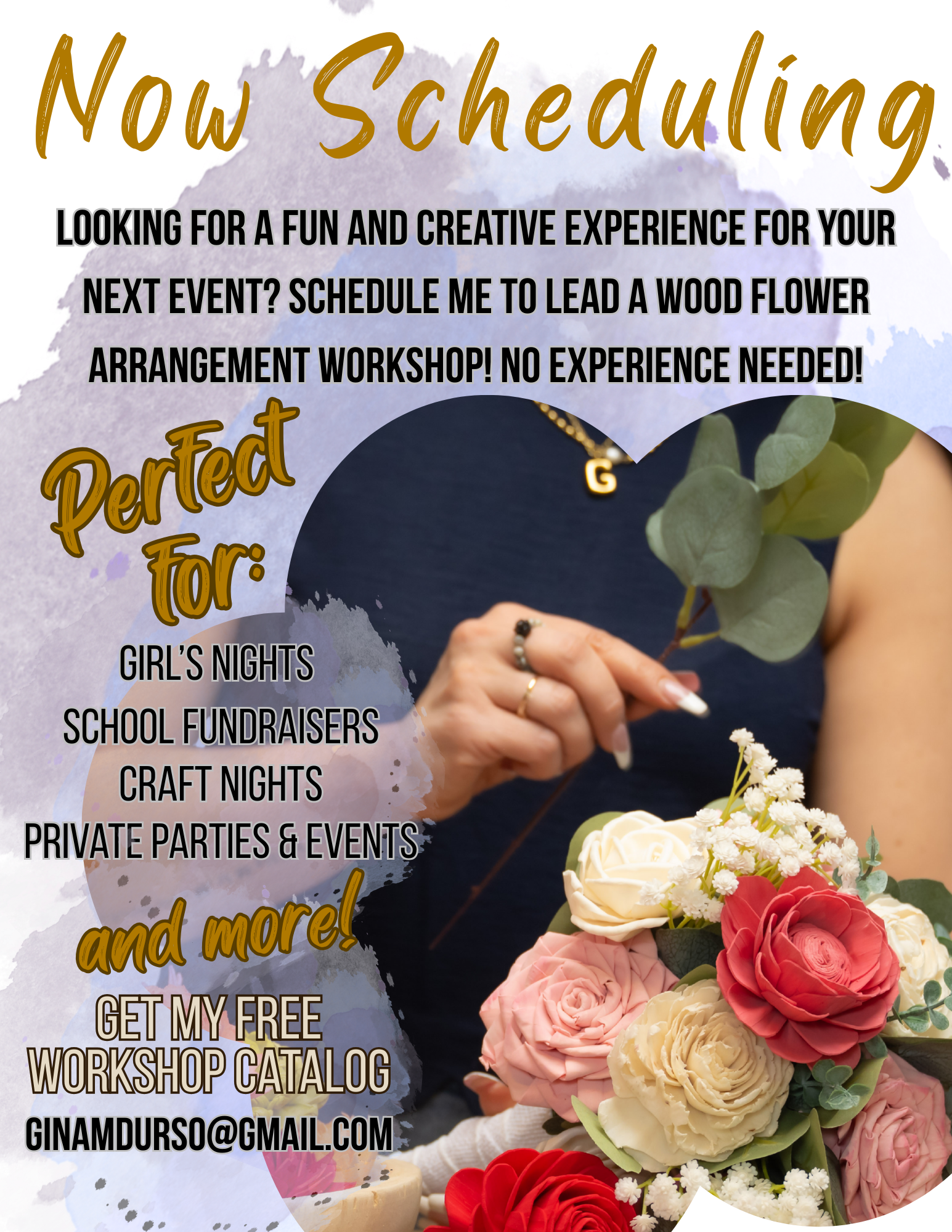 I’ll guide your group through creating a beautiful Wood Flower Arrangement that everyone can take home — no experience needed! These one-evening workshops are fun, beginner-friendly, and a unique way to bring people together.
